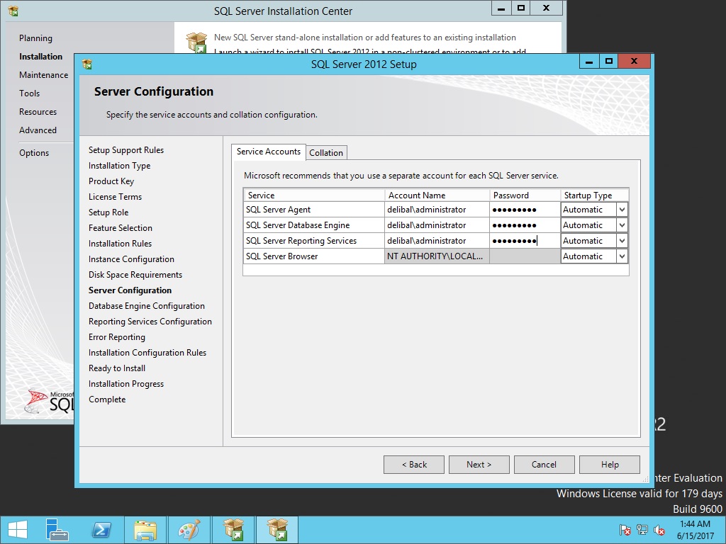 Bu kısımda kurulumdan sonra çalışasak SQL servisleri gözükmekte. Bütün servislerin Startup Type kısmını “Automatic” ‘ e çekiyoruz ve SQL Server Browser haricinde bütün servislere kullanıcı adı ve şifre bilgilerini giriyoruz. Normal bir yapıda bu işlem için sccmsql gibi bir kullanıcı oluşturulup onun bilgileri girilmektedir. Çünkü Administrator kullanıcısının şifresi değiştiği zaman bu servisler problem yaşacaktır.