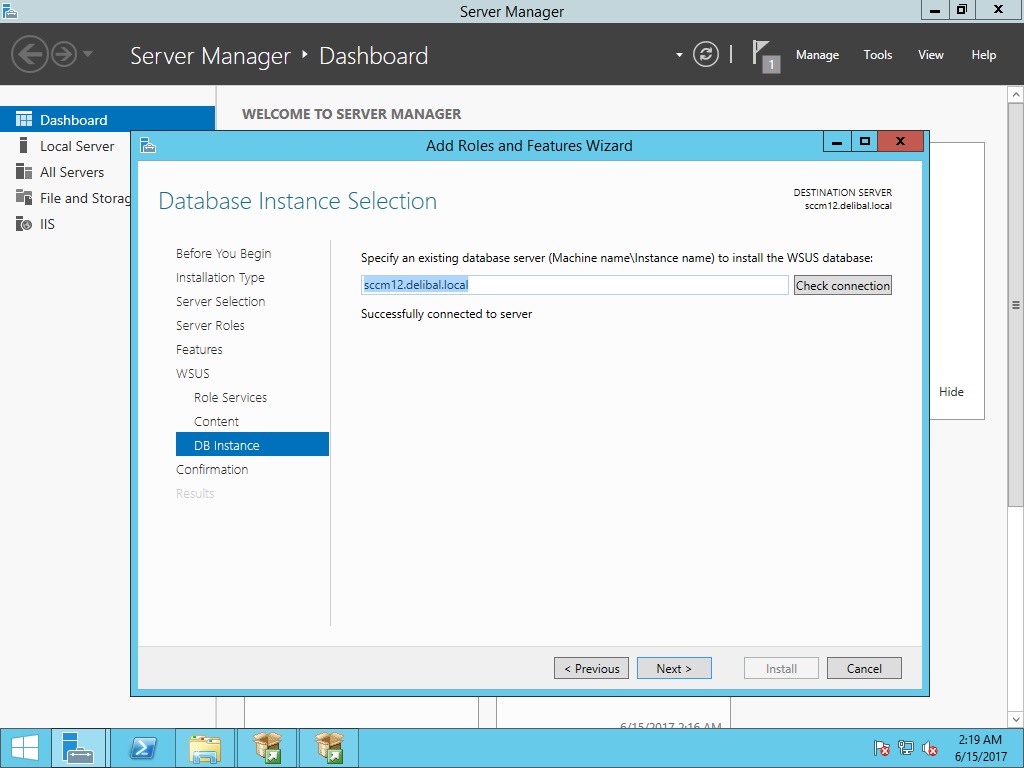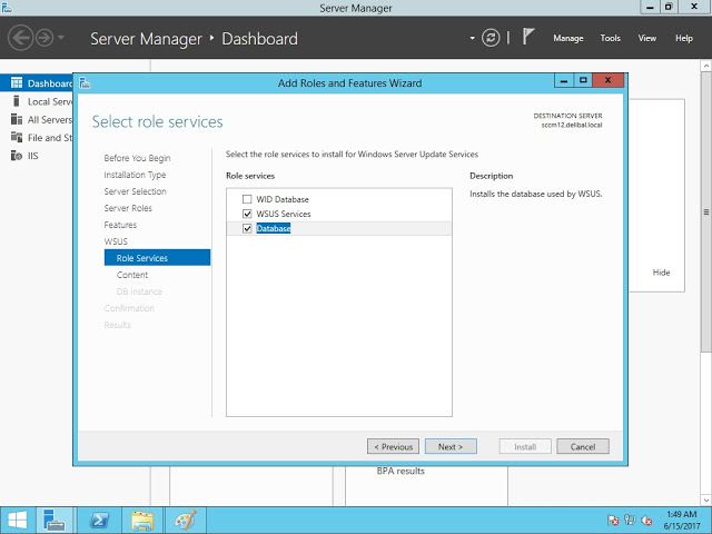 Normalde WSUS kurulumunda WID database seçilir ve WSUS kendi database’ini kullanır. Bu durumda SCCM Sunucu üzerinde SQL kurulu olduğu için Database seçeneği seçiklerek ilerlenir.