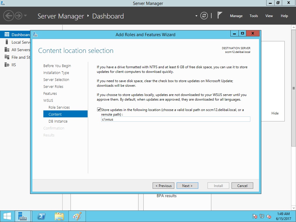 WSUS tarafındandan indirilecek update ve bileşenlerin tutulacağı lokasyonu bu kısımda belirliyoruz. Normal şartlarda farklı bir disk üzerinde bir alan gösterilmesi SCCM performasına doğru şekilde etkili olacaktır.Biz burda test ortamında işlem yapacağımız için C:\wsus path’ini belirliyorum.