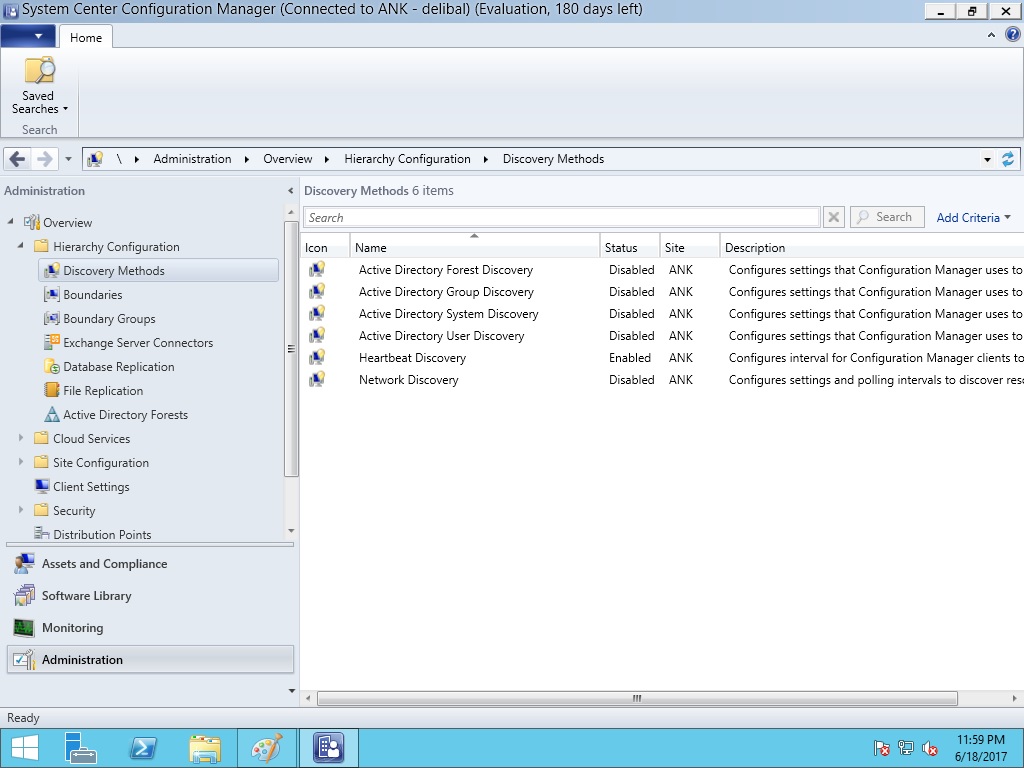 Mevcut keşif metotlarını SCCM Management konsolunu açtıktan sonra Administration > Hiearchy Configuration > Discovery Methods kısmına geliyoruz.