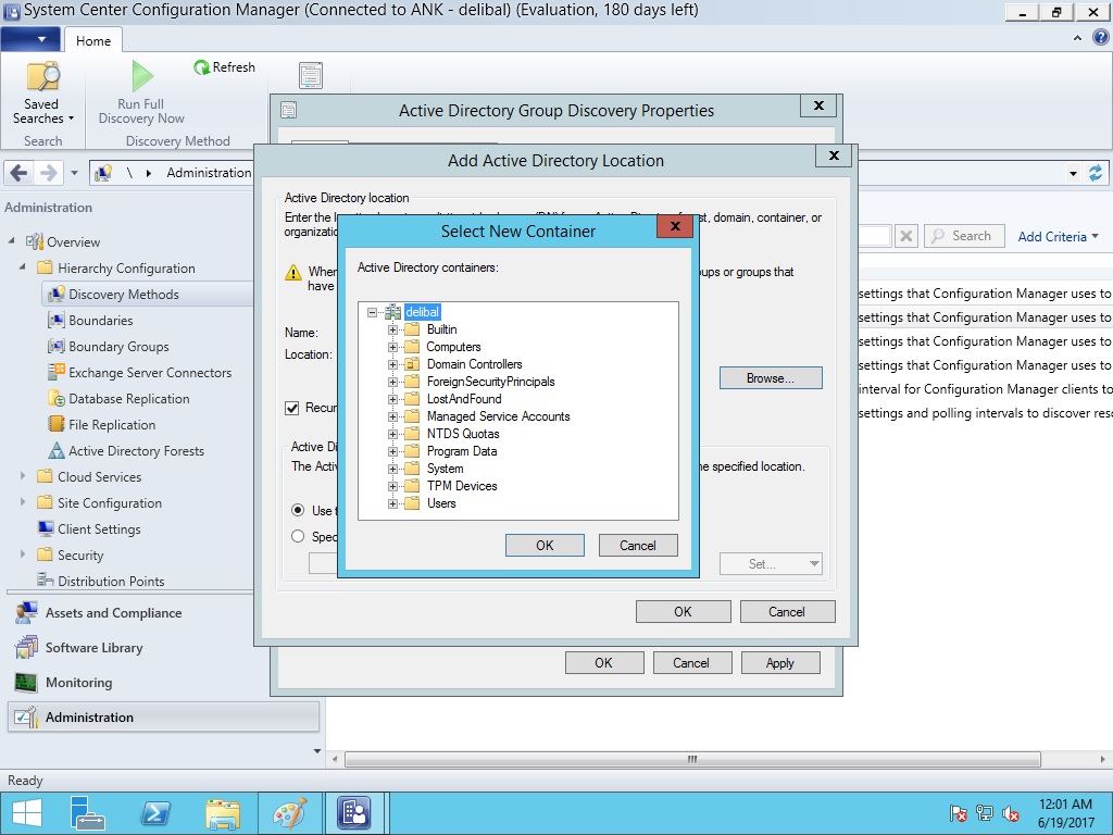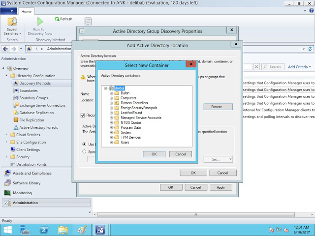 Bu metot da user,computer vb öğelerin üye olduğu security groupları keşfetmemizi sağlar. Enable Active Directory Group Discovery dedikten sonra alt kısımdan add > location diyoruz.