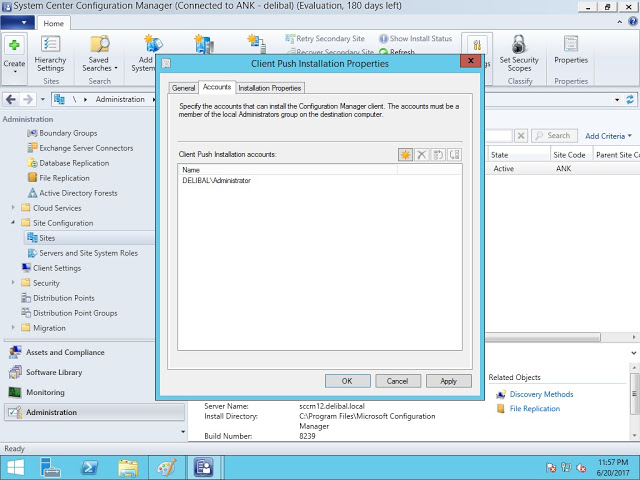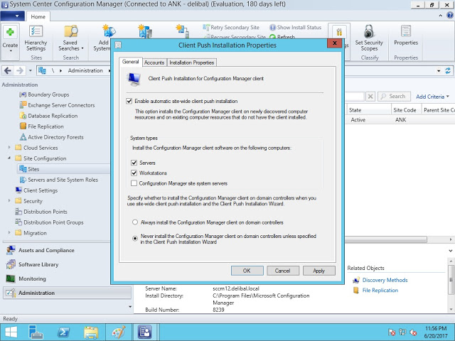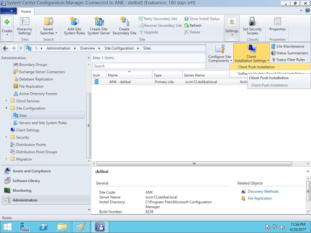 System Center Configuration Manager > Administration > Sites kısmından Settings bölümüne tıklayıp Client Installation Settings‘e tıklıyoruz burdan ise Client Push Installation’a tıklıyoruz.