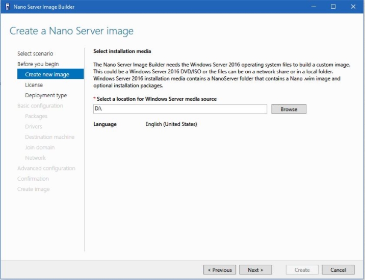 Nano Server Kurulumu yapabilmek için Server 2016 OS ISO image dosyası gerekmektedir. Bu kısımda bu ISO dosyasının lokasyonunu belirtiyoruz.
