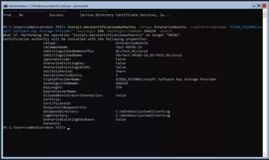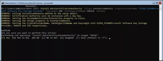 Install-AdcsCertificationAuthority -CAType EnterpriseRootCa -CryptoProviderName “ECDSA_P256#Microsoft Software Key Storage Provider” -KeyLength 256 -HashAlgorithmName SHA256 -Verbose