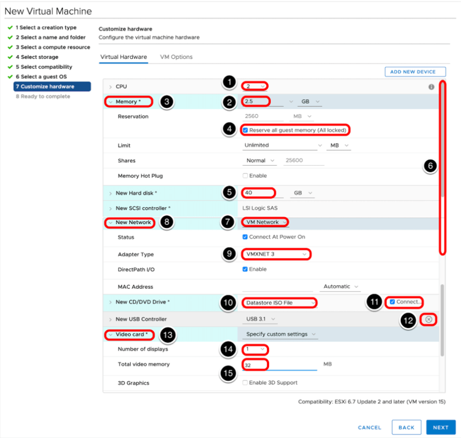 7-8-9 numaralı kısımda network ayarları belirtilmektedir. 9 numarada Network adaptor type VMXNET 3 seçilmiştir. Bunun nedeni ise daha iyi performans vermesidir. VMXNET 3 network adaptor VMware tool yüklenmez ise işletim sisteminde ağ adaptörü görülmeyebilir.