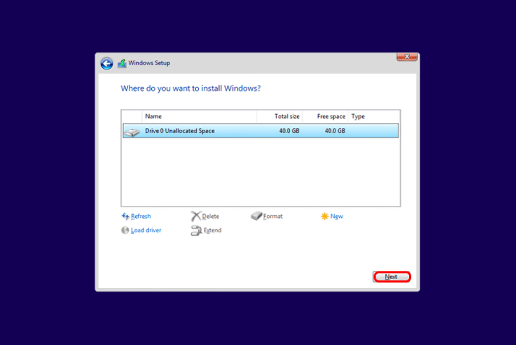 Yükleme yapacağımız diski seçiyoruz. Bu kısımda diski birden fazla partition’a ayarabiliriz. Bu kurulumda tek bir partition seçerek devam ediyoruz.