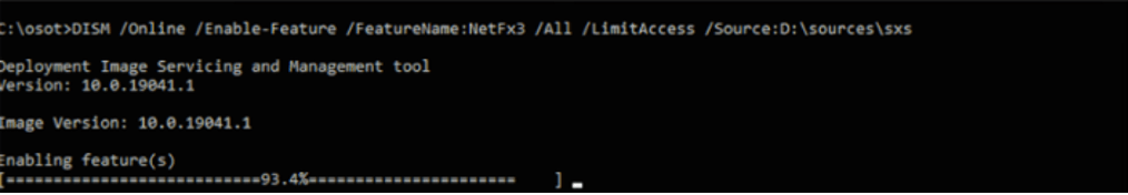Kurulum yaptığımız Windows işletim sistemi ISO’sunu tektrar mount ettikten sonra. Komut satırı üzerinde DISM /Online /Enable-Feature /FeatureName:NetFx3 /All /LimitAccess /Source:D:\sources\sxs komutunu çalıştırarak yüklemeyi tamamlayabiliriz.
