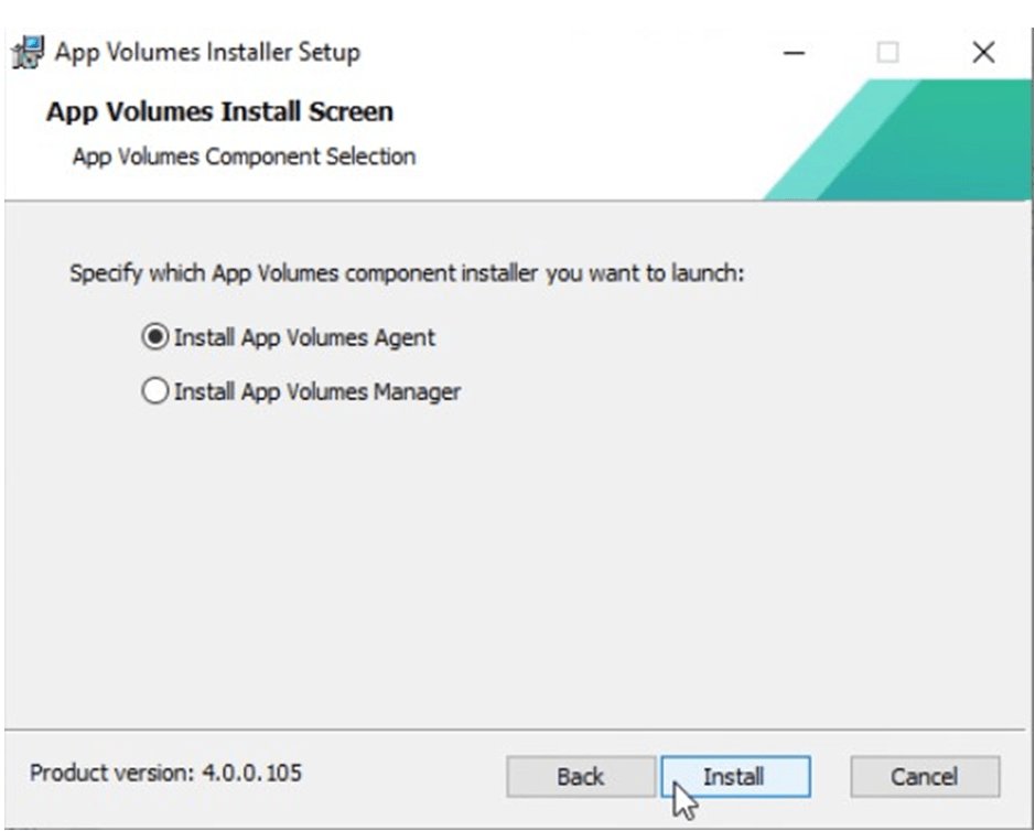 AppVolume ISO dosyasını Master image üzerinde mount ettikden sonra Setup dosyasını çalıştırıyoruz.Karşımıza gelen ekranda Install App Volumes Agent seçeneğini seçip devam ediyoruz.