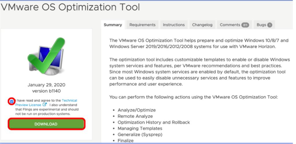 İşletim sistemi optimizasyonu için Vmware’in kendisine ait olan OSOT(Vmware OS Optimization Tool)’u kullanabilirsiniz.Google’da aratıp aşağıdaki şekilde master image üzerine indirin.