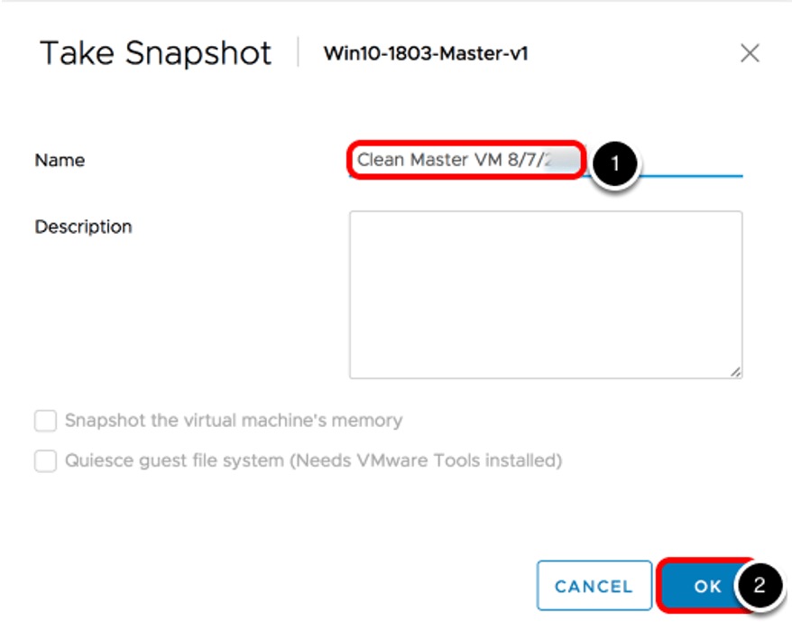 Snapshot için bir isim belirleyip OK diyoruz. Eğer sanal bilgisayar açık konumdayken Snapshot alıyorsanız Snapshot the virtual machine’s memory tick işaretini kaldırmanız gerekmektedir.