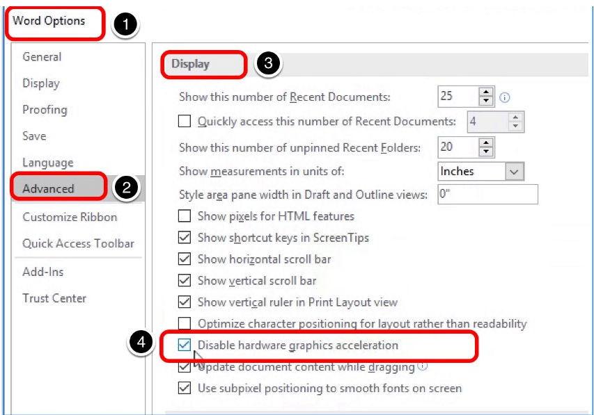 Office vb uygulamalarda bulanıklık yada grafiksel olarak donma gibi problemler yaşıyorsanız Hardware graphics acceleration’ı kapatmanız gerekmektedir.