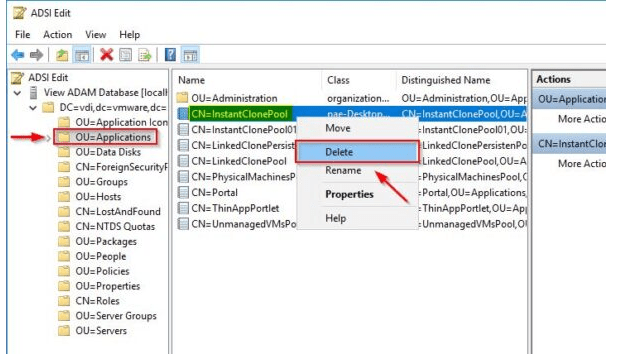 Mevcut Pool OU=Applications altında da olabilir. Burayıda kontrol ediyoruz ve mevcut ise burden da siliyoruz.