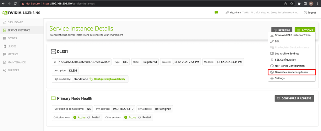 Appliance üzerinde Service Instance > Action > Generate client config token diyoruz.