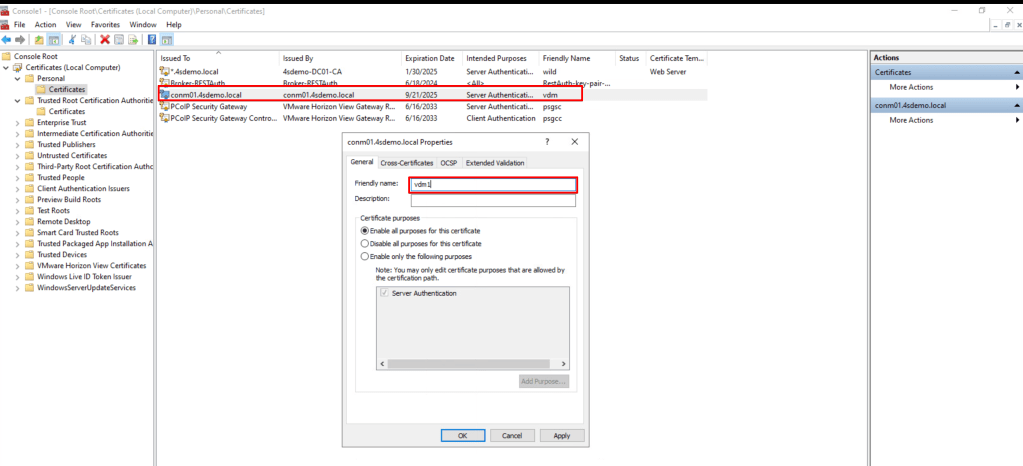 Self-Signed sertifikanın Properties kısmına geliyor ve Friendly Name kısmını vmd1 yada vdmbak olarak değiştiriyoruz.