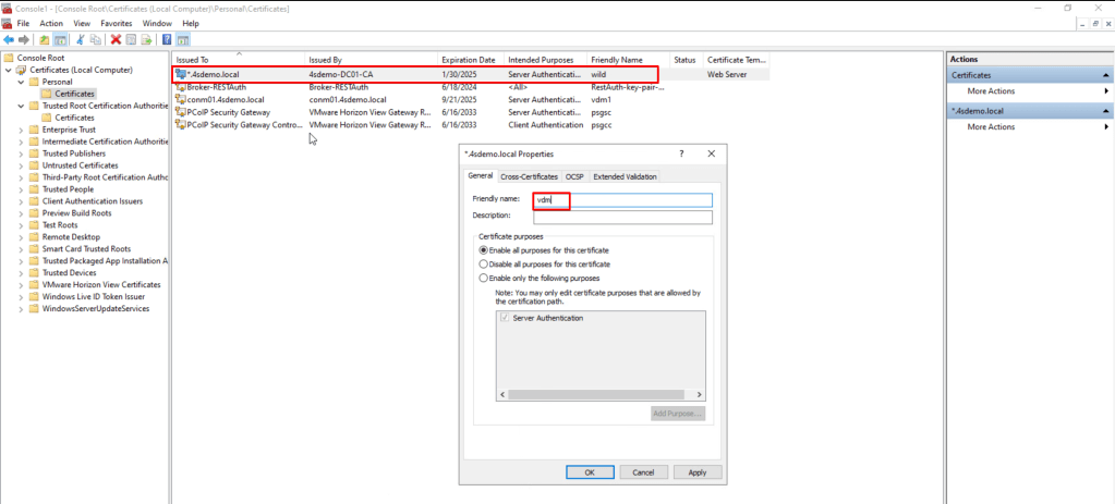 Daha sonrasında wild-card SSL sertifikanın Properties kısmına gidiyoruz ve Friendly Name kısmını vdm olarak değiştiriyoruz.