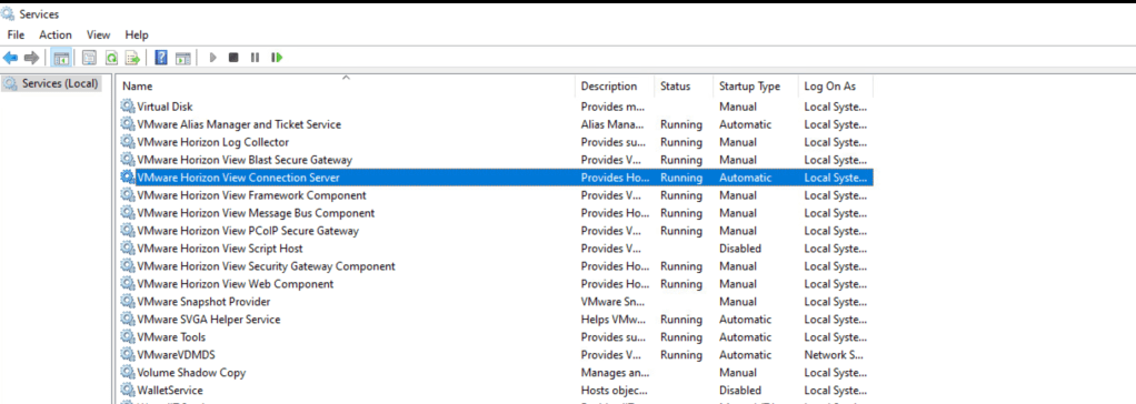 Sonrasında Servisces kısmına geçiyoruz ve VMware Horizon View Connection Server servisini restart ediyoruz.