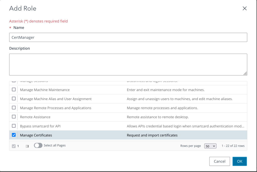 Sertifika yönetimi rolünü oluşturacağımız için ona göre bir isim belirliyoruz ve Manage Certificates seçeneğini seçip OK diyoruz.