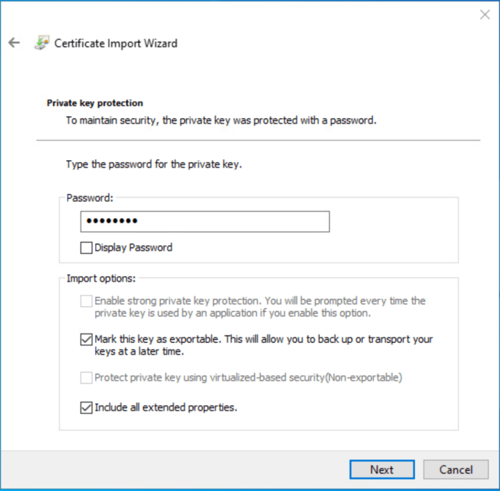 PFX sertifikanın şifresini giriyoruz . Şifre haricinde aşağıdaki görselde bulunan seçenekleri seçiyoruz. Connection Server üzerinde kullanılan SSL sertifikanın Key Exportable olması gerekmektedir. Eğer aşağıdaki seçenekleri seçemiyorsanız SSL sertifikanız Key Exportable değildir.
