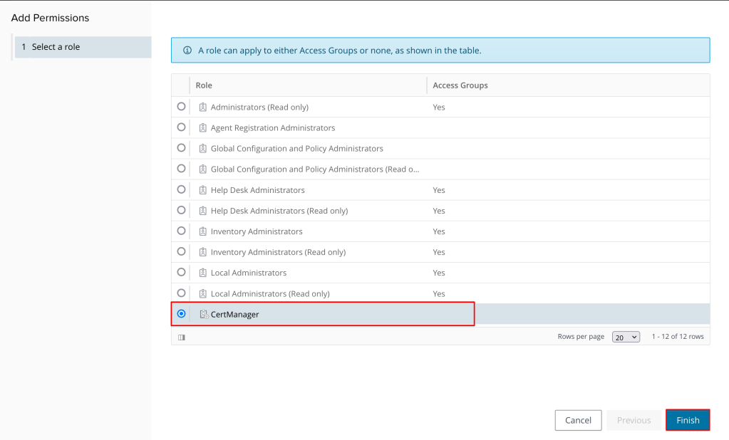 Biraz önce oluşturduğumuz CertManager rolünü seçerek Finish diyoruz.