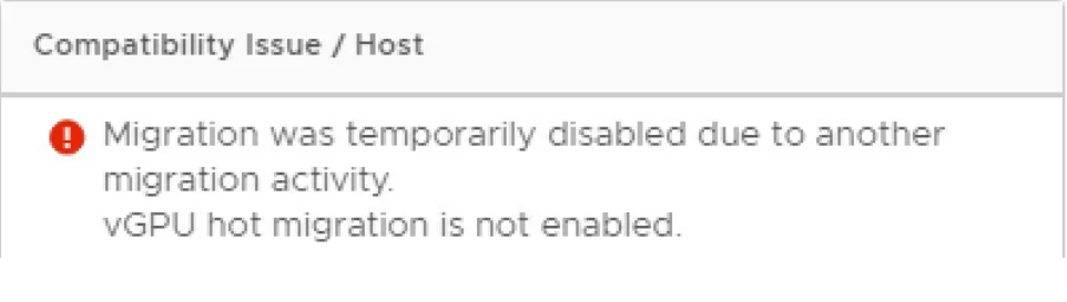 Bu özellik default değerde kapalıdır ve vGPU ya sahip sanal makineyi taşımaya çalıştığınızda aşağıdaki gibi bir hata alabilirsiniz.