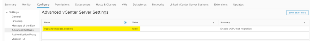 Enable edebilmek için vCenter > Configure > Advanced Settings > kısmında vgpu.hotmigrate.enabled seçeneneği true’ya çekilir.