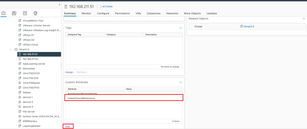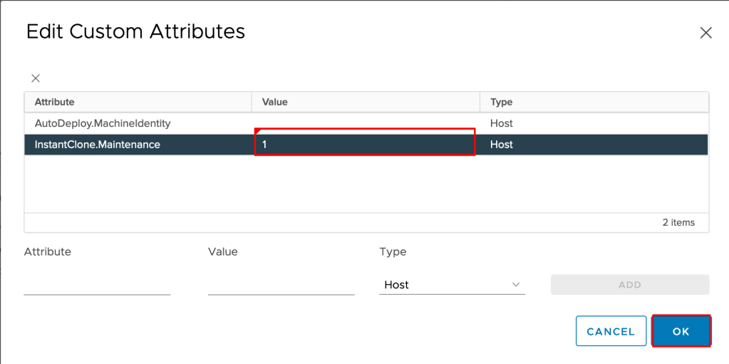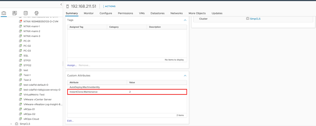 Herhangi bir hostta provisyon yapılmamasını yada hostun maintenance moda alınmasını istediğinizde aşağıdaki görselde bulunan InstantCloneMaintenance Custom attribute değerini değiştirmemiz gerekmektedir.