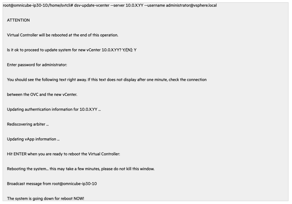 Bu komutu girdikten sonra aşağıdaki örnekte olduğu gibi yeni vCenter şifresini girmeniz gerekecek ve sonrasında OVC Sanal makinesini reboot etmeniz için enter tuşuna basmanız gerekecektir.