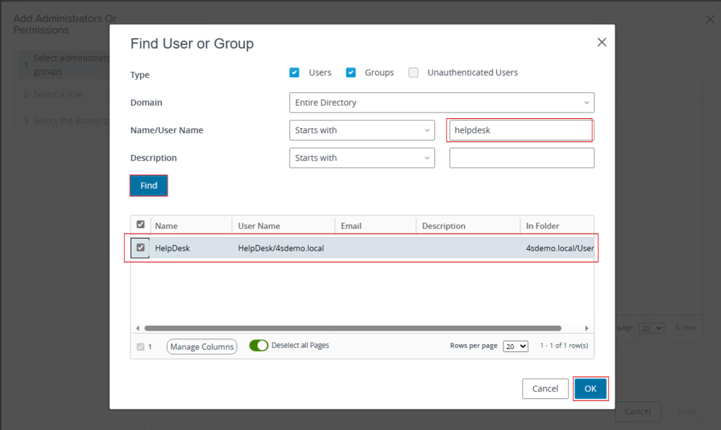 Yetki vermek istediğimiz grup ismini Name/User name kısmında aratıyor ve alt kısımda çıkan gruba tıklayarak seçiyoruz.