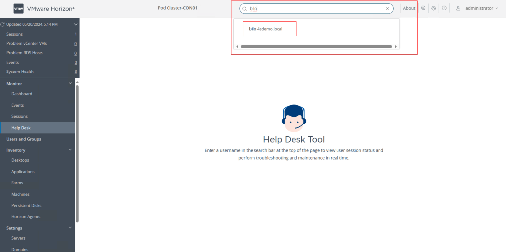 VMware Horizon Admin arayüzünün sağ üst köşesinde bulunan arama butonu ile Help Desk Tool’u kulanabilirsiniz. Arama yerine bilgilerini almak yada bağlanmak istediğiniz kullanıcının ismini yazmanız yeterli olacaktır.