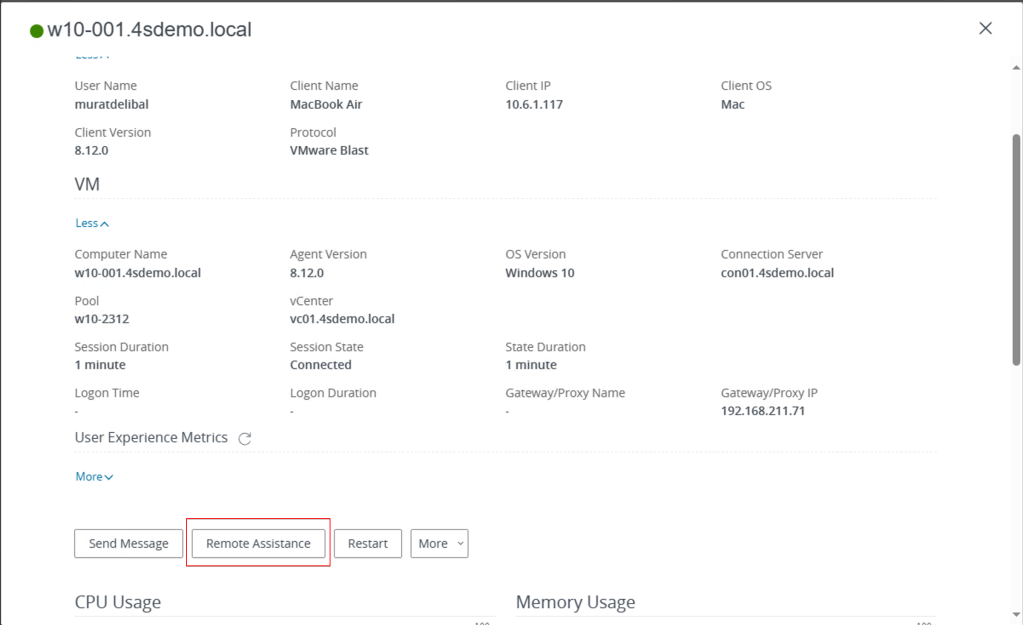 Bu kullanıcının bağlı olduğu sanal makineye mesaj gönderebiliriz, remote assitance ile birlikte bağlantı sağlayabilir yada yeniden başlatabiliriz.
