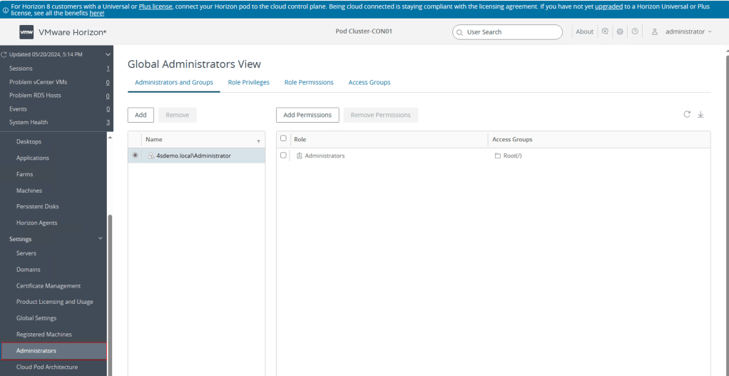 Help Desk yetkisi verebilmek için yapınızda bulunan connection server’a https:/connectionserverurl/admin url’i üzerinden bağlanıyoruz. Administrators kısmına geliyoruz. Administrators and Groups kısmında Add butonuna tıklıyoruz.